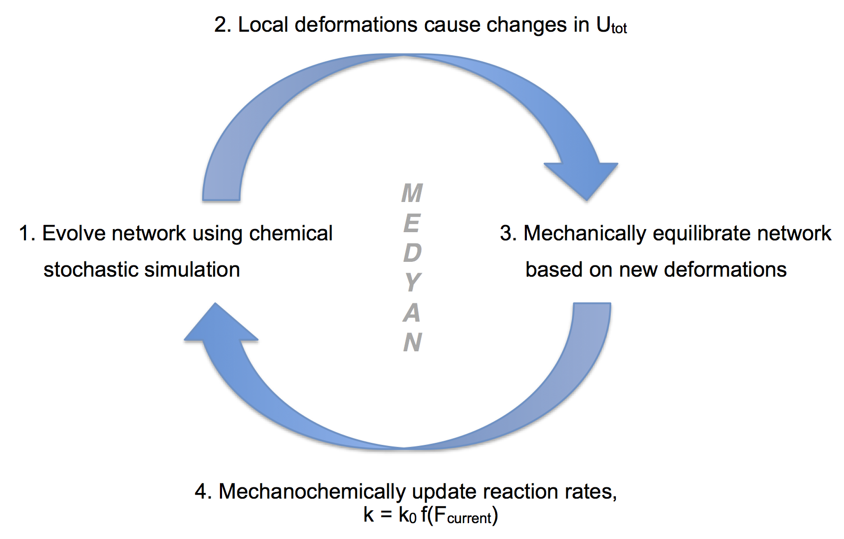 While most cytoskeletal models in literature emphasize either reaction-diffusion modeling of cytoskeletal chemistry or semi-flexible polymer chain mechanics of the constituent filaments, the MEDYAN model intimately couples the chemical processes of an active cytoskeletal network with its underlying polymer mechanics by iteratively swtiching between stochastic reaction-diffusion simulation and network mechanical equilibration (Fig 1), producing an efficient yet detailed cytoskeletal network evolution. With chemical and mechanical representations of semi-flexible polymers, cross-linking molecules, molecular motors, as well as polymer branching and severing molecules, MEDYAN allows for an explicit treatment of the key elements involved in cytoskeletal evolution (Fig 2). For a detailed description of the methodology and assumptions of this model, as well as its current capabilities, see its original paper in PLoS Computational Biology.